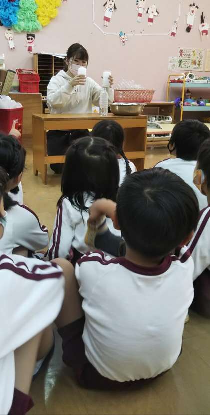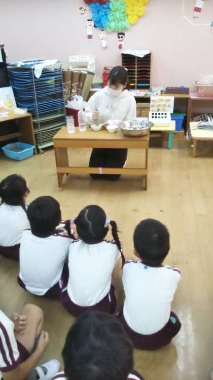 今月は「よくかむ」ことの大切さを教えてもらいました。食べ物に見立てた入浴剤を10回と30回すりつぶした(かんだ)ものをつくり、どちらが溶けやすいか(消化されやすいか)の実験をしました。
