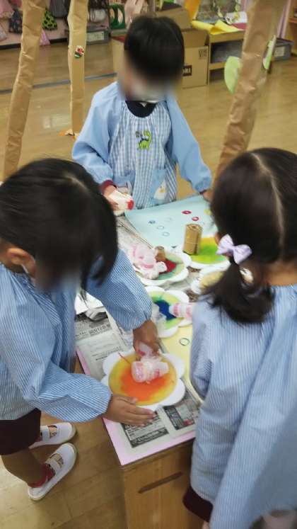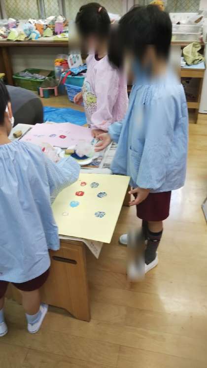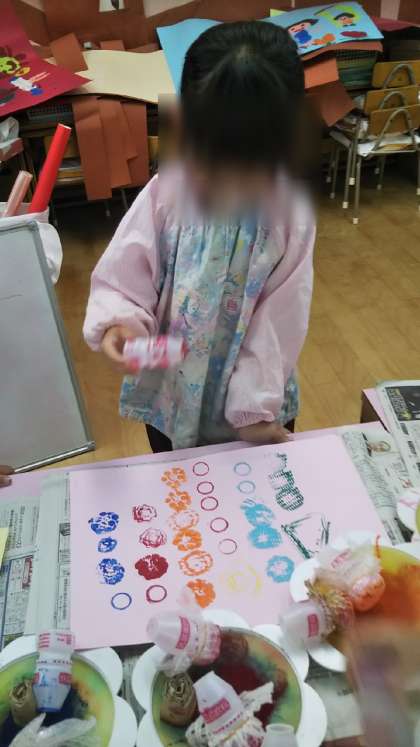 さくら組がスタンプ遊びをしていました。色々な形のスタンプを選んで好きな模様を作っていました。