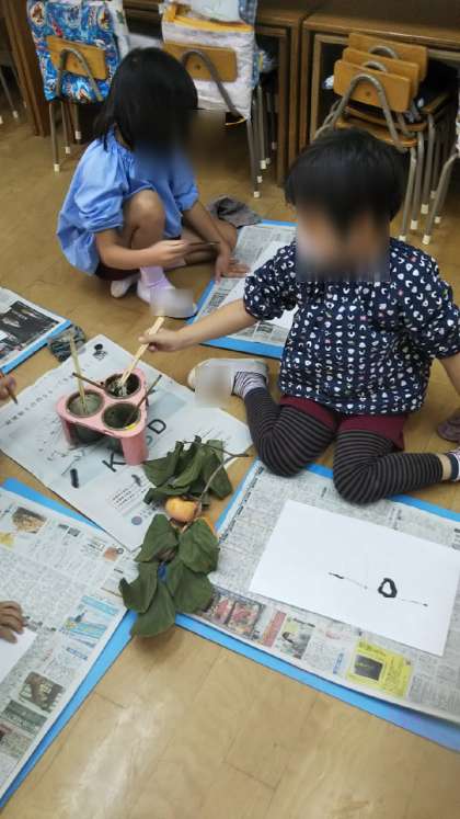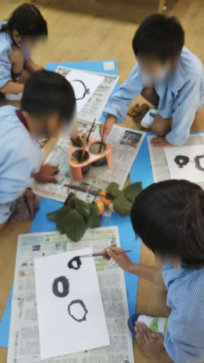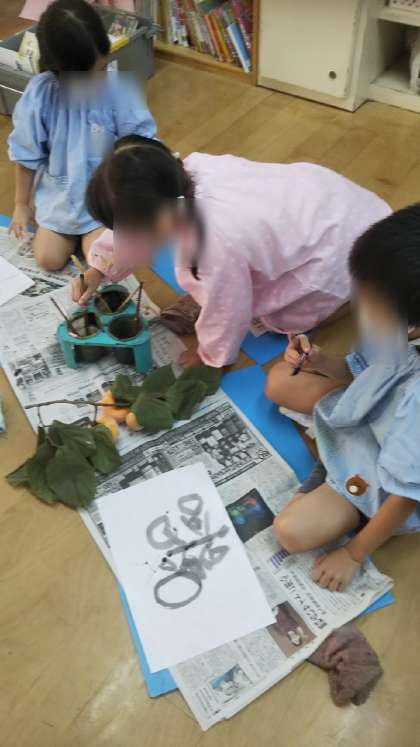 あやめ組が墨で柿をかいていました。じっくり見ながら丁寧にかいていました。どんな柿ができるかな??