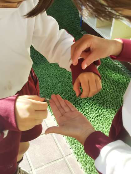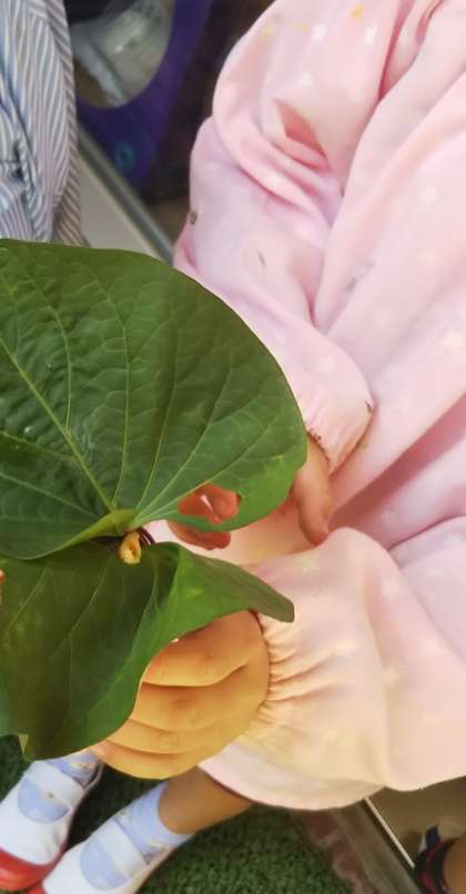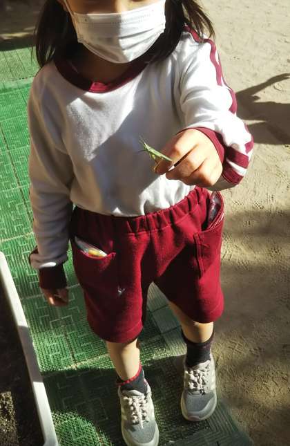今日、またバッタが卵を生んでいました。前回気がつくとビンに生んでいたのでケースに土を入れておいたのですが…今回は葉っぱの上に生んでいました…。また土に埋めてみましたが…孵りますように…。子どもたちが、「バッタさん可愛いな。おさんぽいってくるわ!!」とバッタを手にもって園庭を歩いていました。