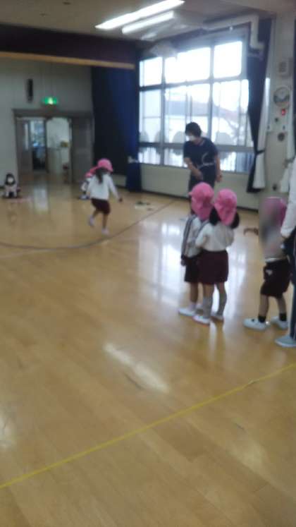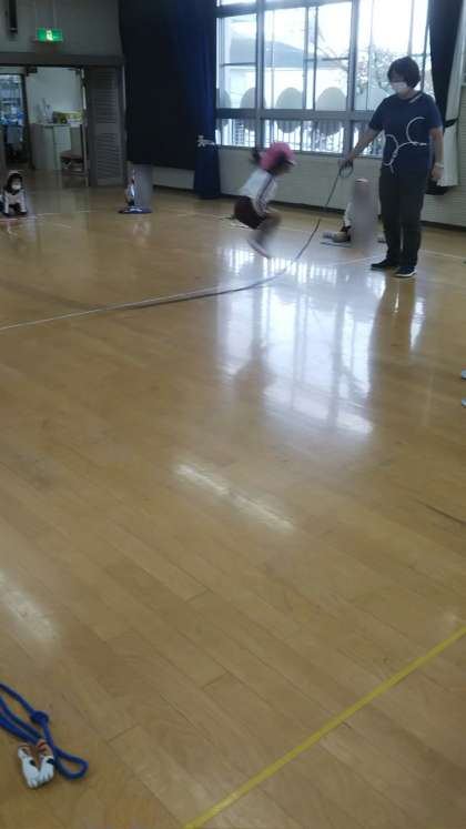 両足をそろえてタイミングを見てジャンプ!リズミカルに連続で跳べるようになってきたお友だちも、一回ずつゆっくり跳ぶお友だちもみんなで応援していました。