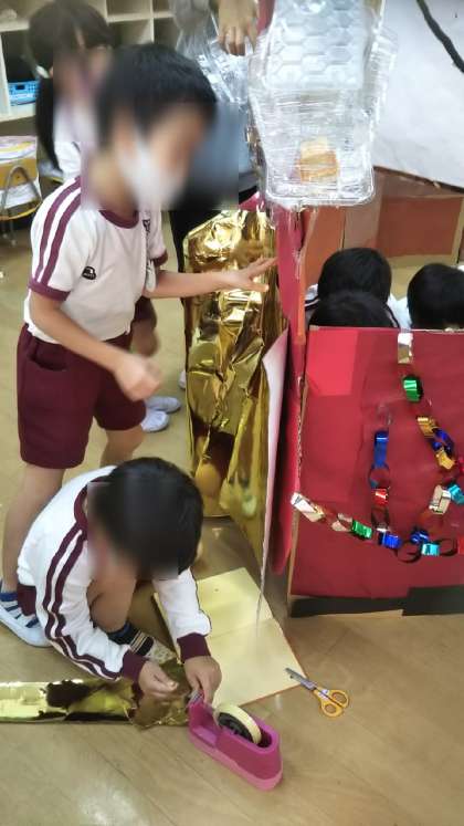先日のあやめ組の大きな製作。今日はなにやら細かいところをつくっています。
