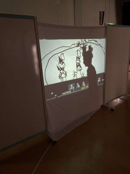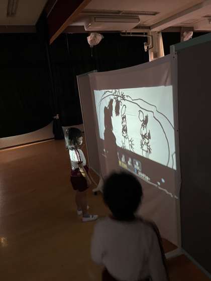 あやめ組が影絵遊びをしていました。かいた絵を映したり、自分の影を映したりして楽しそうでした。