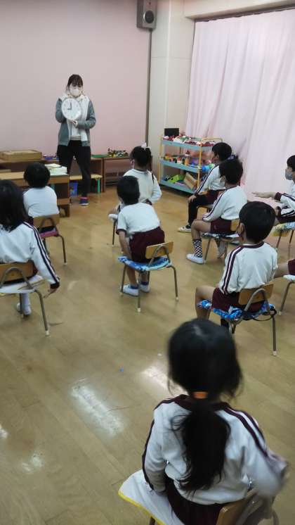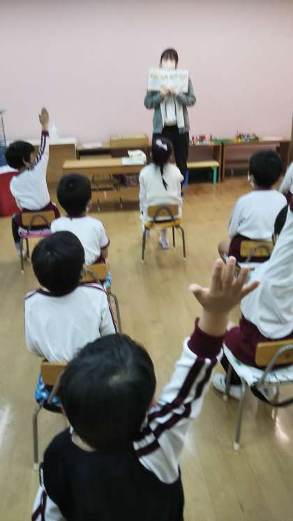 今月は「早寝早起き」「睡眠の大切さ」の保健指導でした。絵本をみながら「どうしてねこすけ君は寝るのが遅くなったのかな?」と聞かれると「寝る前にゲームしてる」「スマホ見てたから」「テレビはちょっとだけにしなあかん」「(ご飯のあとに)おやつ食べてる!」など、しっかりとお話を聞いていた様子がわかりました。