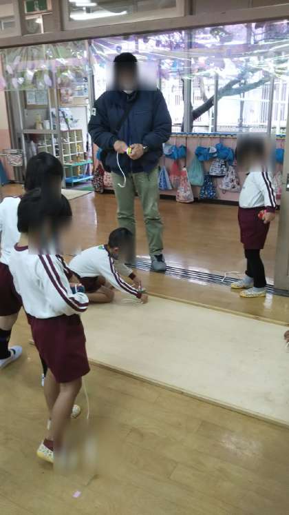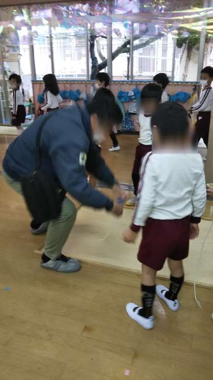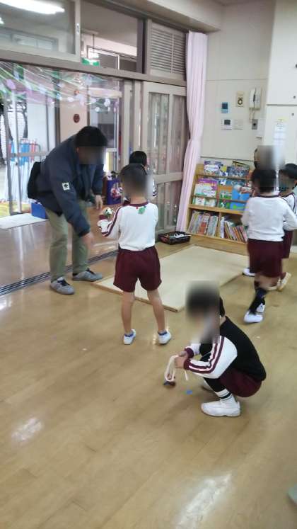 職員室にあやめ組がやってきて主事さんに「今、忙しいですか?」と。こまを教えてもらいたくてきたようです。