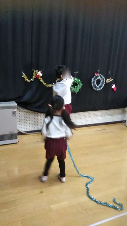 明日はサンタさんが来てくれるお楽しみの日!遊戯室をきれいに飾付けました♪サンタさん待ってるよー☆楽しみだね!