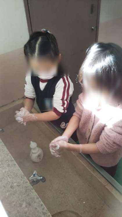 魔法のローションをしっかり手にすりこんで手洗いです。しっかり洗えてるかな?