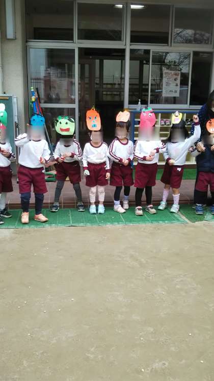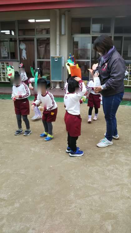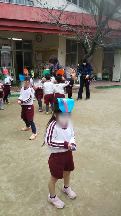 さくら組が昨日の鬼のお面をかぶって豆まきをしていました。心の中の「泣き虫鬼」や「怒りんぼ鬼」「寝ぼすけ鬼」をやっつけようと「鬼はー外!!福はー内!」と元気いっぱい豆をまいていました。