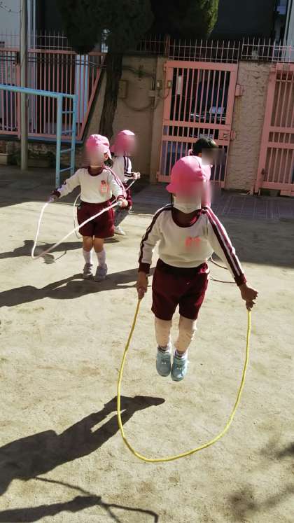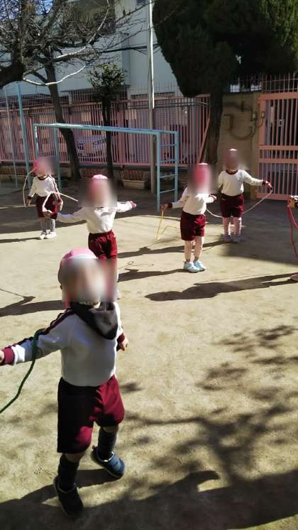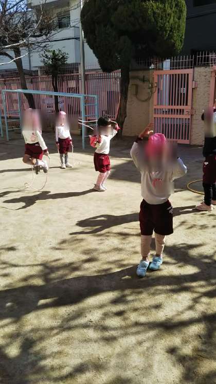 今日はとてもいい天気!暖かい日差しのなかで、さくら組さんがなわとびを頑張っていました。