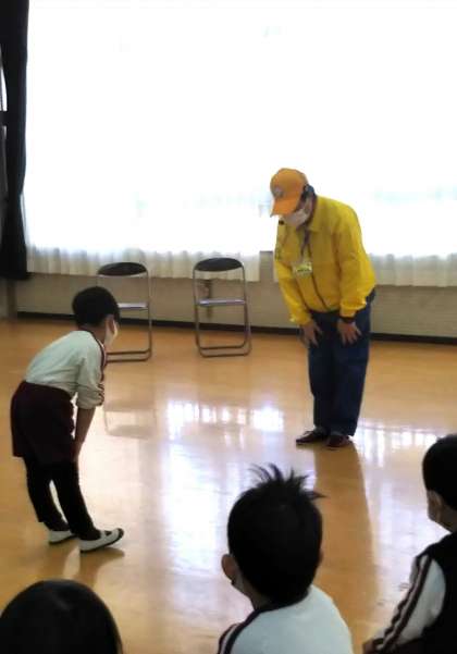 もうすぐ小学校に行くあやめ組さんに安パトさんが「通学路における安全啓発」のお話をしてくださいました。画面をみながらとても分かりやすく3つの約束「交通ルールを守る」「あいさつをする」「ついていかない」を教えてもらい、子どもたちもしっかり聞いていました。後で実際にあいさつや、信号が青になったらどうやって渡るかを子どもたちもしてみました。