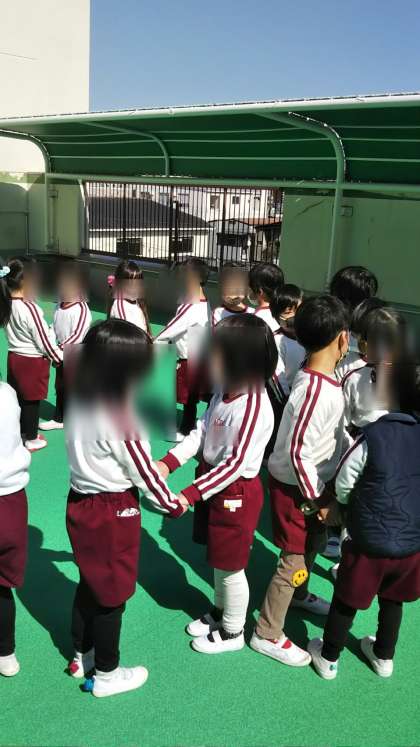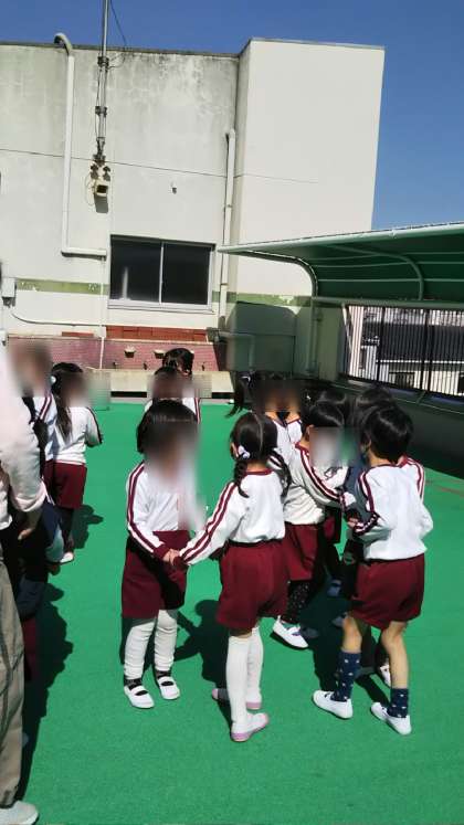 今日は屋上もとっても気持ちいい日差しでした♪そんな気持ちいい屋上でさくら組がなかよし遊びをしていました。こんどはお弁当食べたりしたいね♪