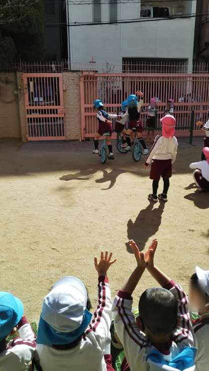 3人のメリーゴーランドにチャレンジしていたあやめ組さん。何度も繰り返してこつを掴んで見事成功!!みんなの前で披露していました。さくら組も大喜び。拍手をおくっていました。