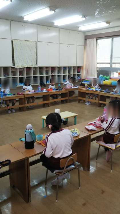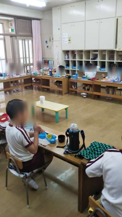 今日はお部屋で大きく距離をあけて、ロの字形に机を並べてお弁当を食べました。2年間で初めて友達の顔が見える状態でのお弁当でした。にこにこと「またこれで食べたい」という子どもたちの姿がありました。みんなで食べられて良かったね!嬉しかったね!