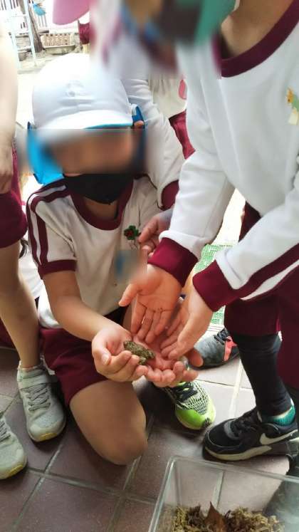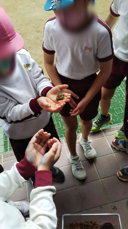 冬眠からさめたカエルを見て子どもたちも大喜び!かわいい!さわってもいい?と久しぶりのカエルの姿に大喜び。