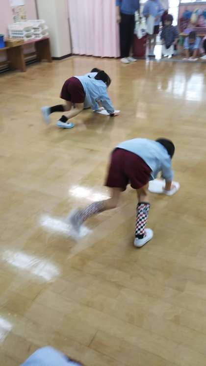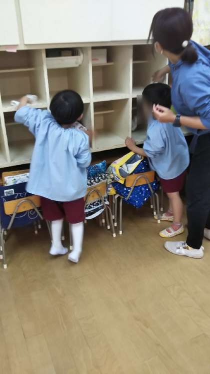 あやめ組が保育室をきれいに拭き掃除していました。「次のあやめ組さんのためにピカピカにしようね」みんなで頑張りました♪