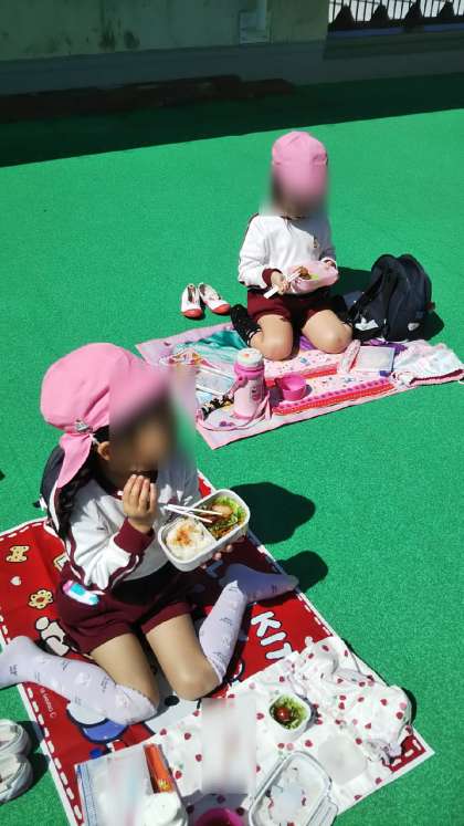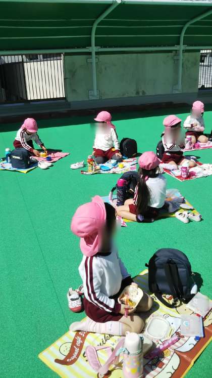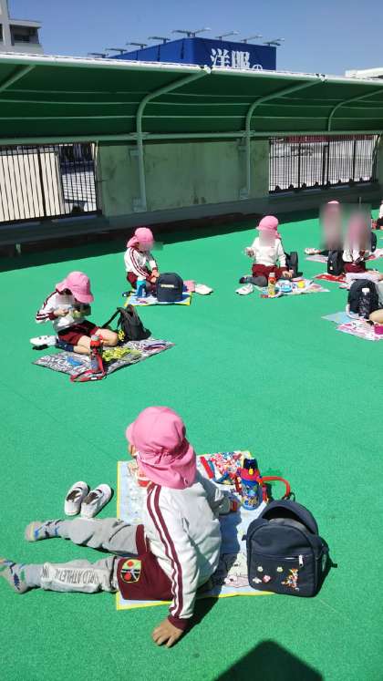 さくら組は屋上でお弁当を食べました。気持ちのいい日差しで遠足気分♪うれしいね