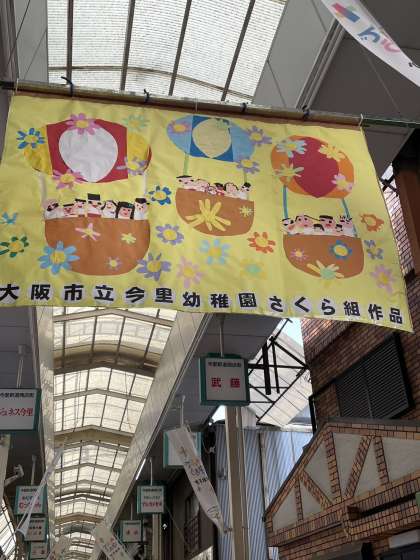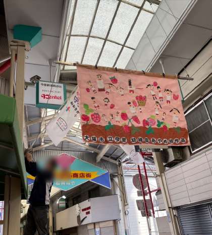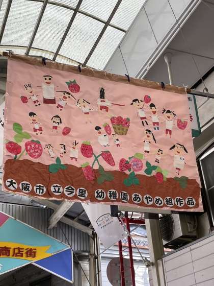 新しい吊り看板を飾りました。可愛いイチゴやお花がいっぱいの春の看板です。商店街を通る際には子どもたちの可愛い作品をぜひご覧ください☆