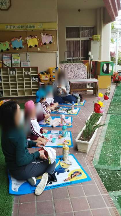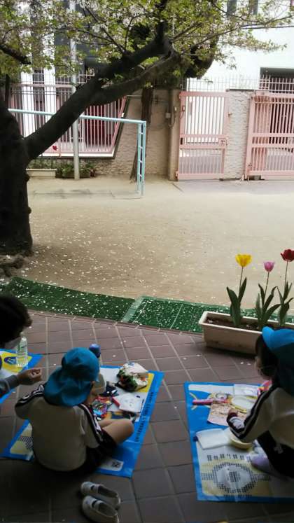 今日もお花見弁当をしていたくまちゃんの子どもたち。桜はさらに葉桜に…。今年のお花見は今日が最後かな?楽しかったね。