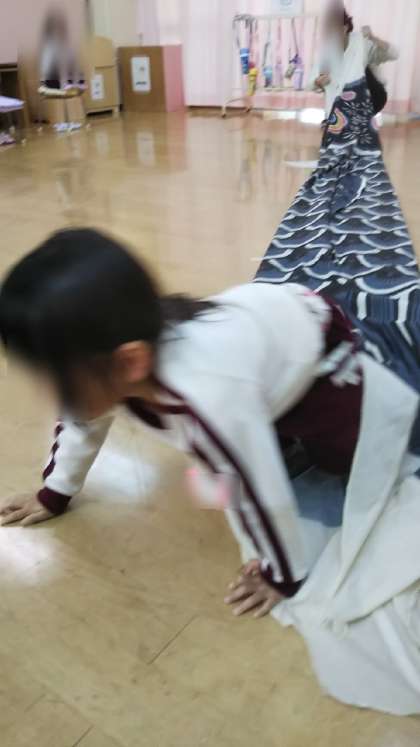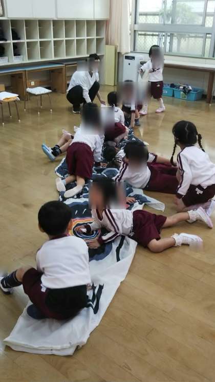大きなこいのぼりに興味津々なさくら組。広げたとたんにみんなでお布団のようにごろ〜んと寝転がっていました。