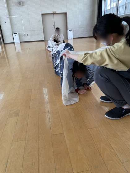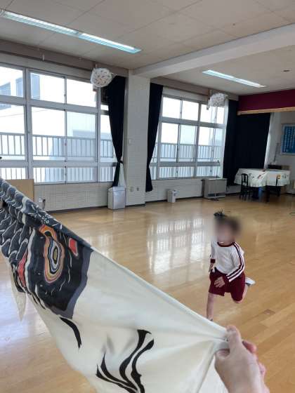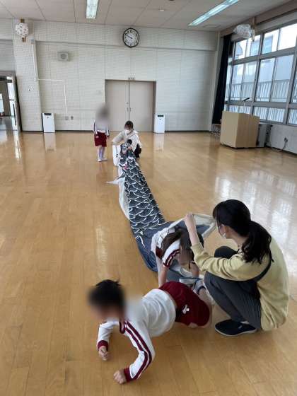 あやめ組もこいのぼりで遊びました。くぐったり、こいのぼりに向かって走ったり!楽しんでいました。