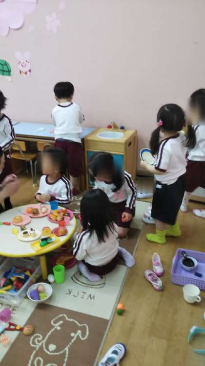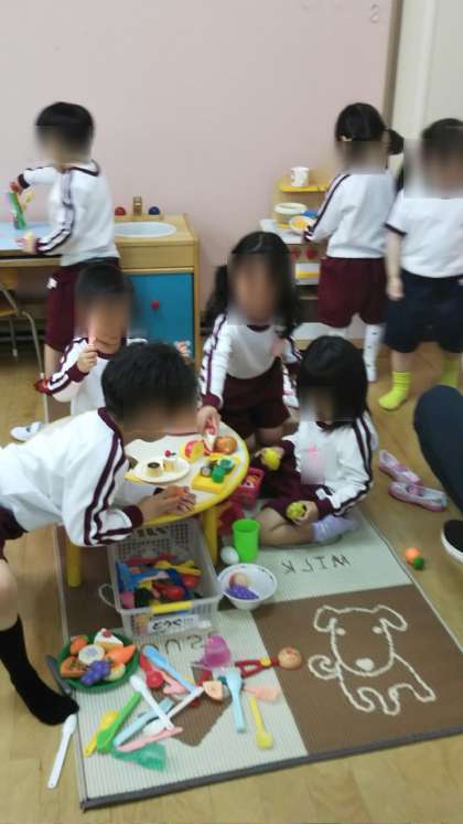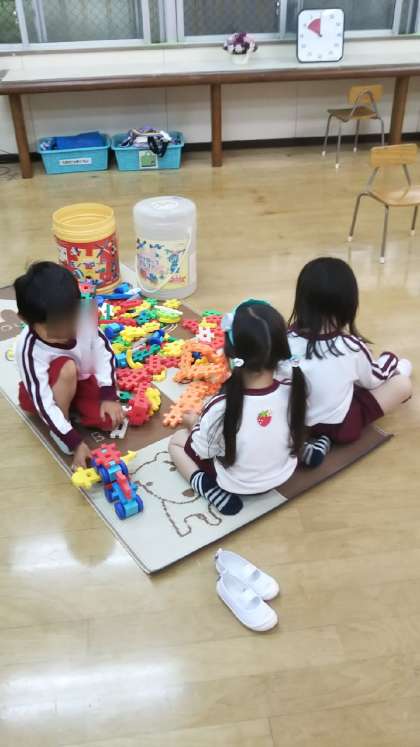 さくら組さんは保育室で楽しそう。まだまだ自分のしたいことに一生懸命ですが、少しずつ友達の存在に気づいたり、一緒にすることが楽しくなってきたりしています。