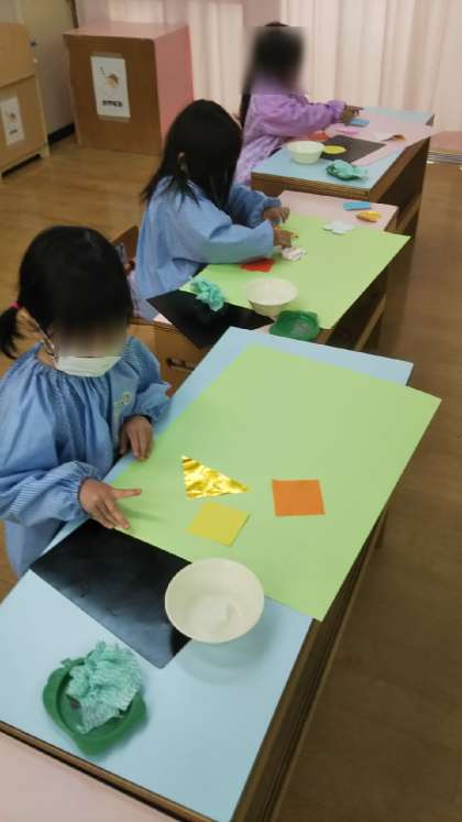 さくら組がのりを使って、こいのぼりに模様を貼っていました。みんなとても丁寧にはっていました。「これポテトチップの形や」「これは豆やなあ」「ハートの形が好き!」等色々な話をしながら楽しんで作っていました。「これ持ってかえれる?」「ママに見せたいなー」と持って帰ることも楽しみにしていました。
