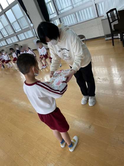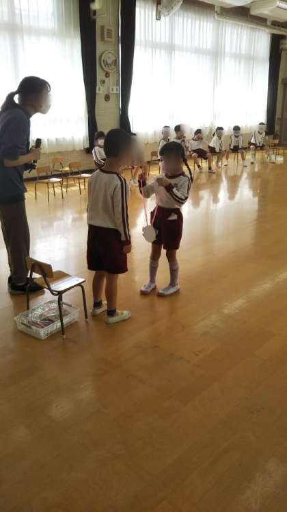 今日は4月生まれさんの誕生会。4月生まれは一人だけでしたがみんなでお祝いできました。プレゼントはあやめ組が作ったかわいいペンダント♪仲良し遊びもして楽しい会になりました。