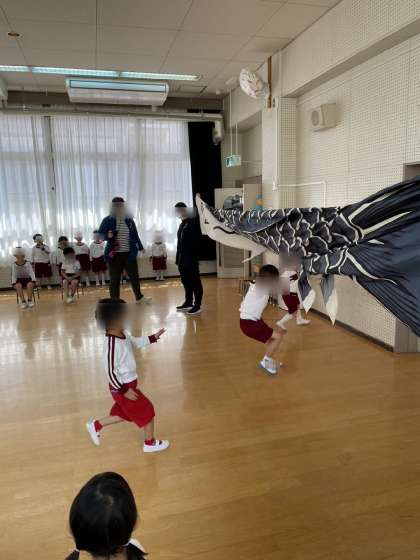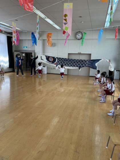 さくら組はこいのぼりに向かって「よーいどん!」元気いっぱい走りました。こいのぼりにタッチ!!