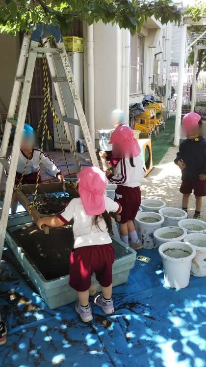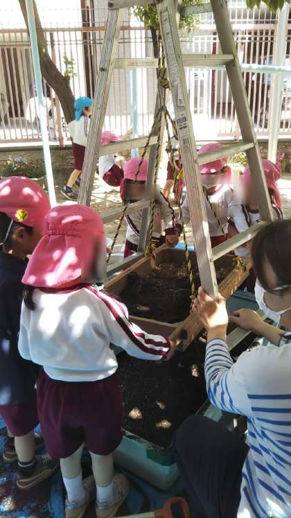 土を大きなふるいに入れて ふるっていきます。それを見ていたさくら組が興味津々!「やりたい!」と集まってきました。
