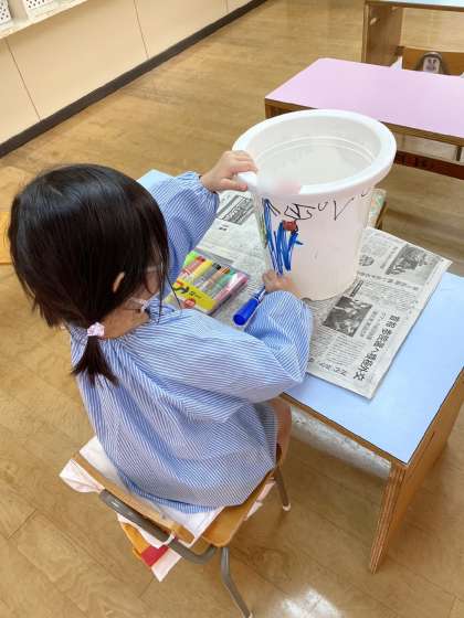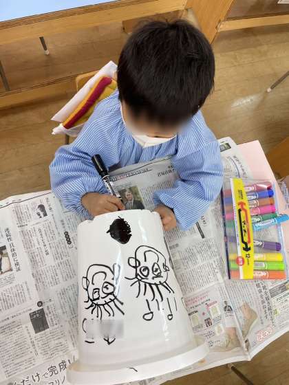 さくら組は、苗植えを楽しみに植木鉢に好きな絵をかいていました。たくさん野菜ができたらいいね♪大きく育ちますように♪