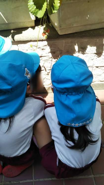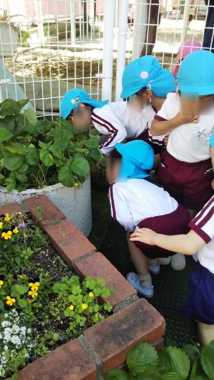イチゴが赤く色づいてきました♪あやめ組がみんなで見に行きました。「あ、赤いのあった!」「ここにもイチゴある!」とみんな大喜び。イチゴをじっとみながら「♪ちっちゃなイチゴがいいました〜♪」と歌っていました。