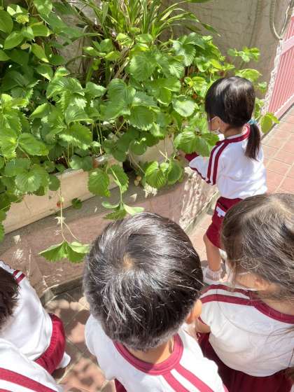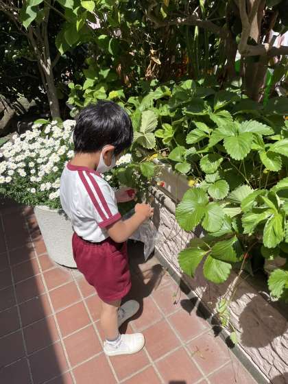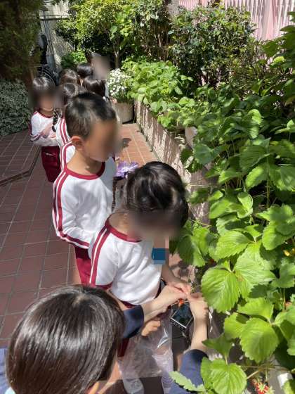 昨日、みんなで見て、収穫を楽しみにしていたイチゴを順番に収穫していきました。赤い、美味しそうなイチゴを見つけてね♪