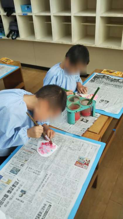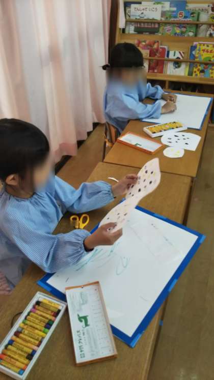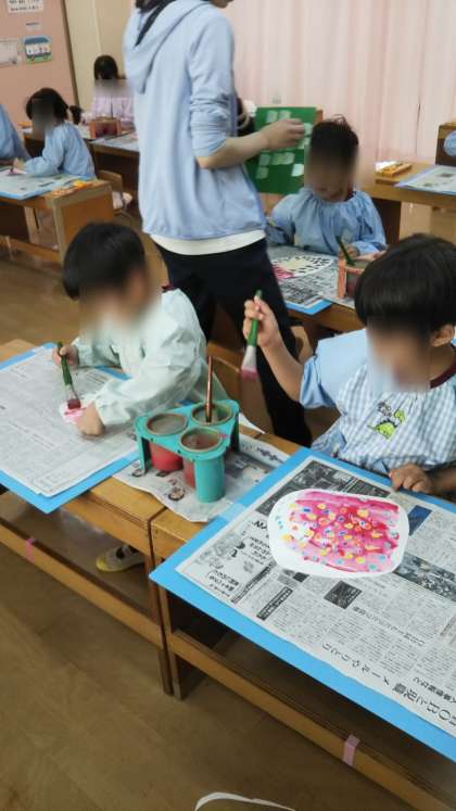 あやめ組はバチックでイチゴを作っていました。絵の具をぬって、クレパスでかいた種が浮き出てくると「わーー!」と歓声があがりました。