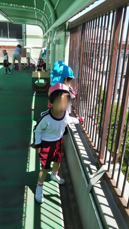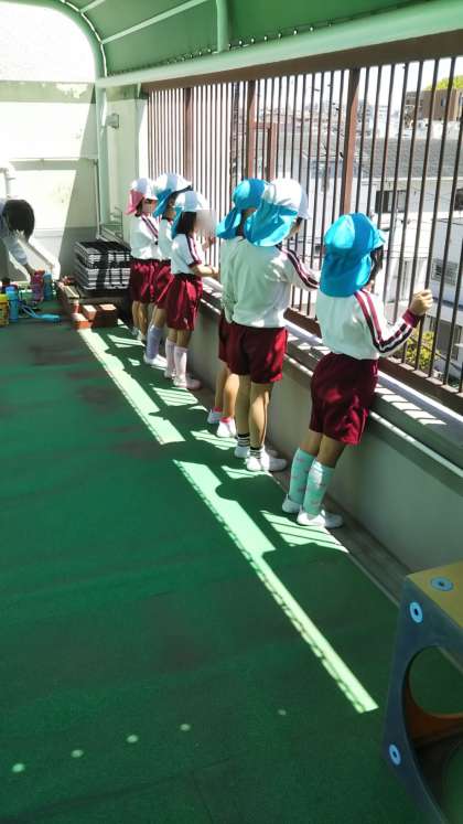 屋上から下を見るのが楽しいね♪いつもと違う景色が嬉しいね。
