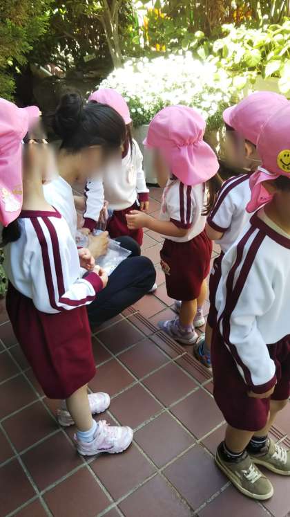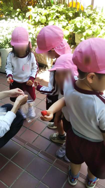 今日はさくら組がイチゴを摘みました。真っ赤になった美味しそうなイチゴが見つけられたかな?