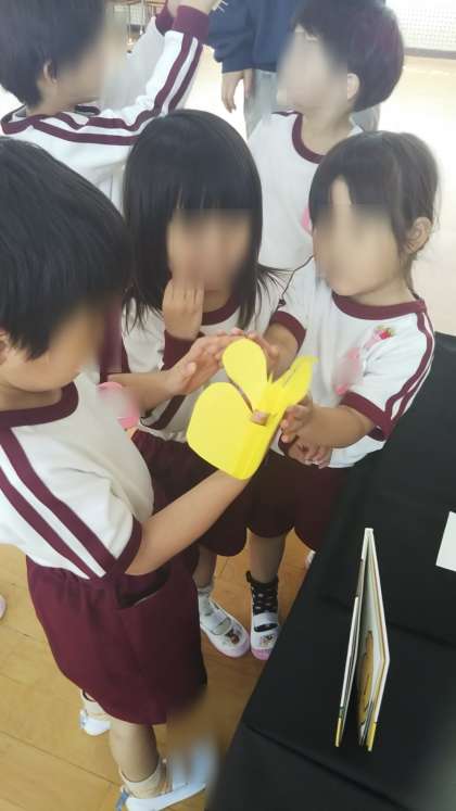 切り紙の蝶が出てくる絵本を見たあと、本当に切り紙の蝶を見せていただいて、それに夢中になっていました。不思議だったのかな?