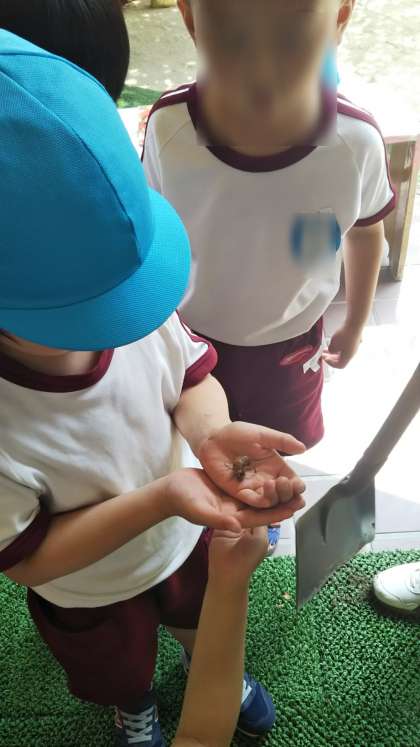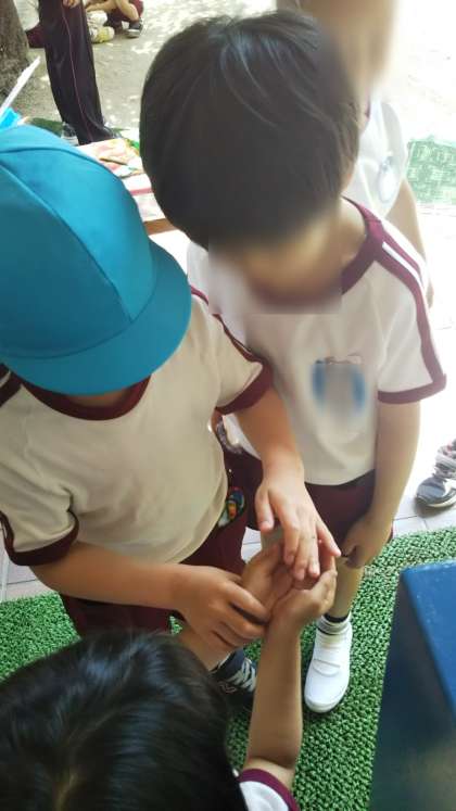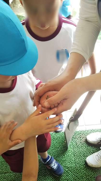 急に暑くなったからでしょうか?園庭をセミの幼虫が歩いていました。「うわ!これ何!?」「さわってみたい!」と興味をもって見ていました。その後はそっと、庭に帰してあげました。夏になったらまたあおうね♪