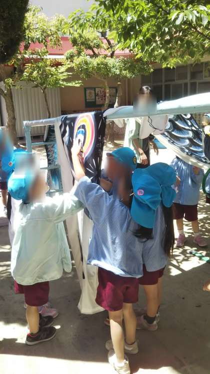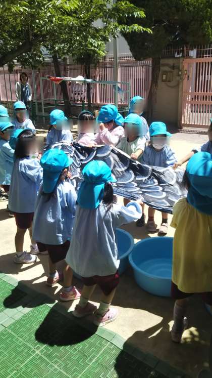 最後は一番大きなこいのぼりを洗いました。みんなで絞って、地面につかないよう慎重に運んで干しました。「ばいばい!また来年ね」「こいのぼりさん、またね!」と最後にこいのぼりにお別れをいってこいのぼりのお洗濯終了です!