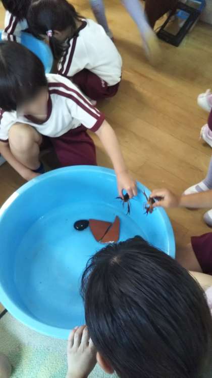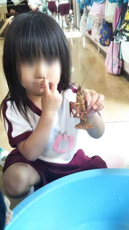 ザリガニさんとのふれあいタイム?背中からそっと持つんだよ。ちょっと怖い?ドキドキするね。ザリガニをつかめた子どもたちはなんだか誇らしげでした。