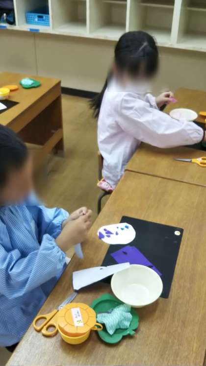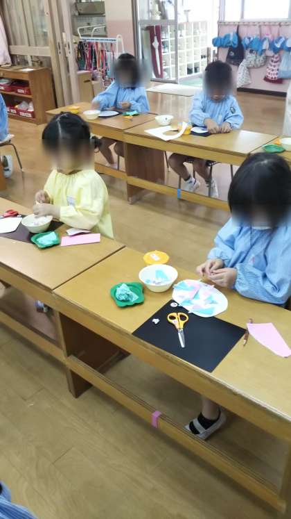 園庭のアジサイがきれいに咲いています。あやめ組はちぎり紙でアジサイ作り!「優しい色のアジサイにする」「僕は青が好き!」と思い思いのアジサイを作っていました。
