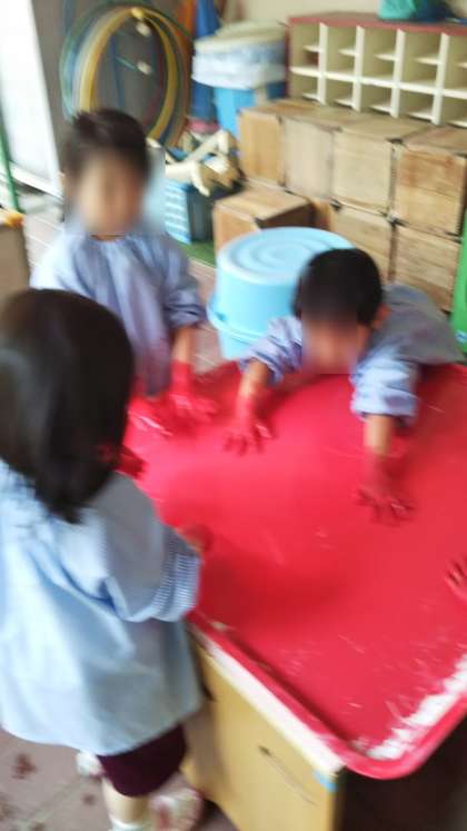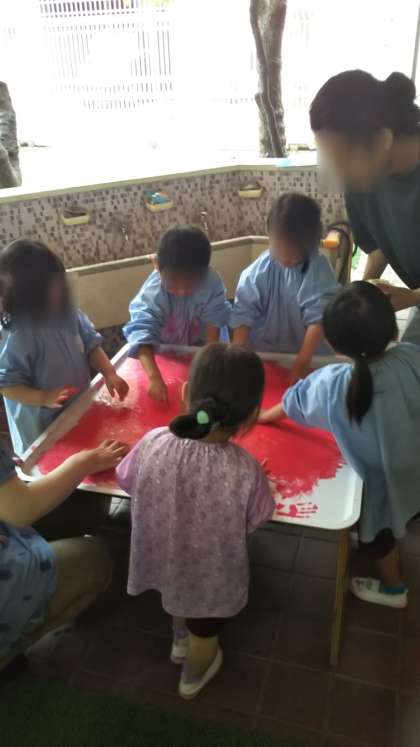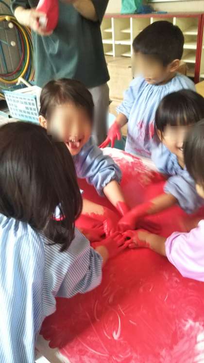 さくら組がフィンガーペイントで遊びました。ペタペタ?さらさら?気持ちいい〜♪