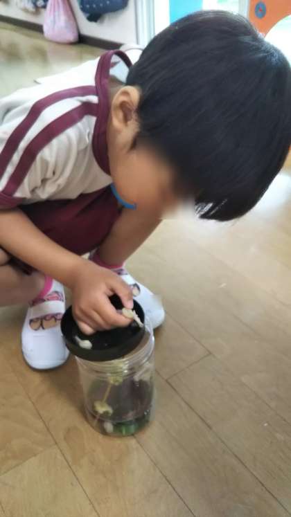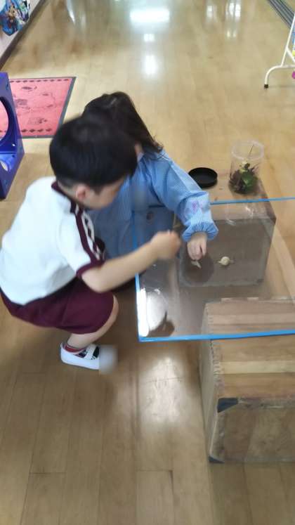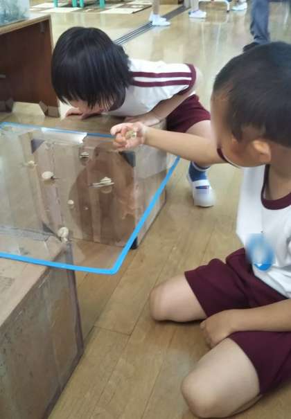カタツムリを観察!透明の板の上で進む様子を下から見てみたり、板にくっついている強さを感じたりして興味深そうでした。