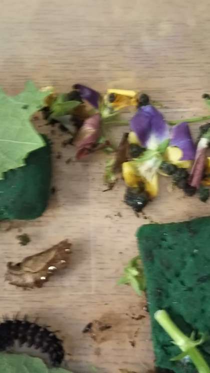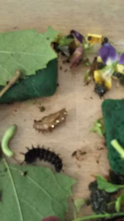 こどもたちが見つけたツマグロヒョウモンの幼虫がサナギになりました。大喜びでサナギになったことを教えてくれました。