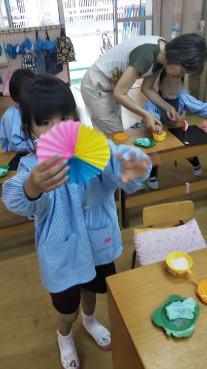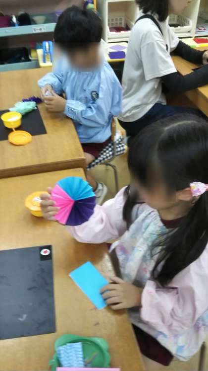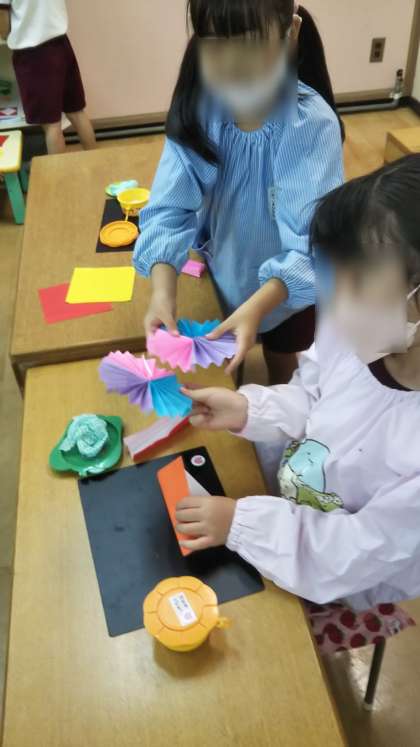あやめ組は蛇腹折りの飾りを作っていました。色の組み合わせを考えて、きれいなカラフルな飾りができました。満足そうな顔でできた飾りを見ている姿が可愛かったです。