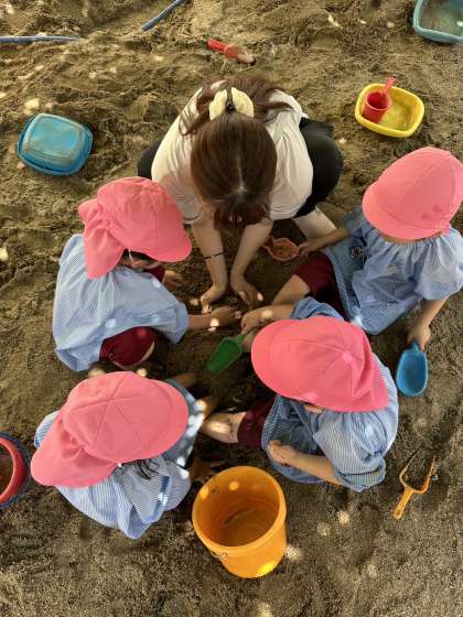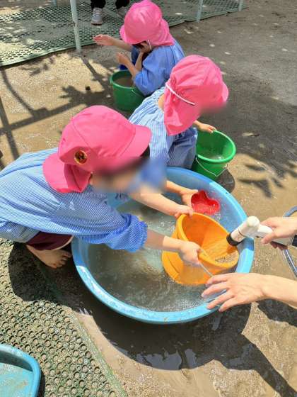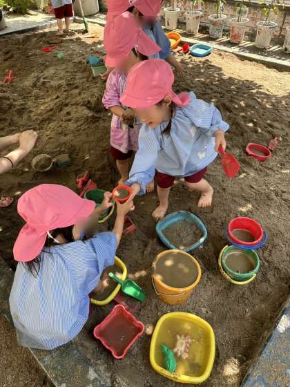 今日は暑いくらいのいい天気でした。まさに泥んこ日和!さくら組さんが楽しそうにしていました。水の気持ちよさや泥の感触を楽しんでいました。