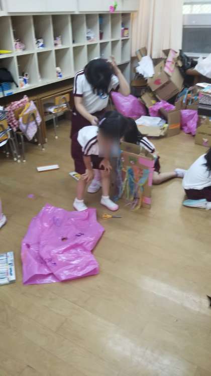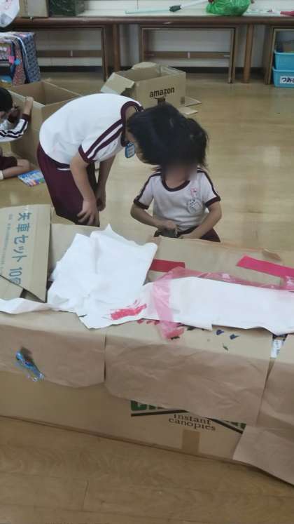 あやめ組が夏祭りに向けてのお店づくりを頑張っています。友達と協力しあって何ができてくるのかな?