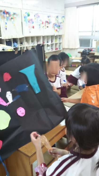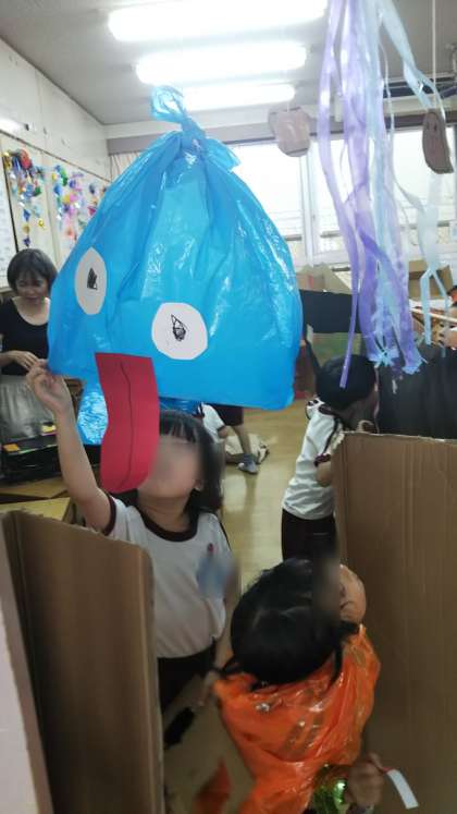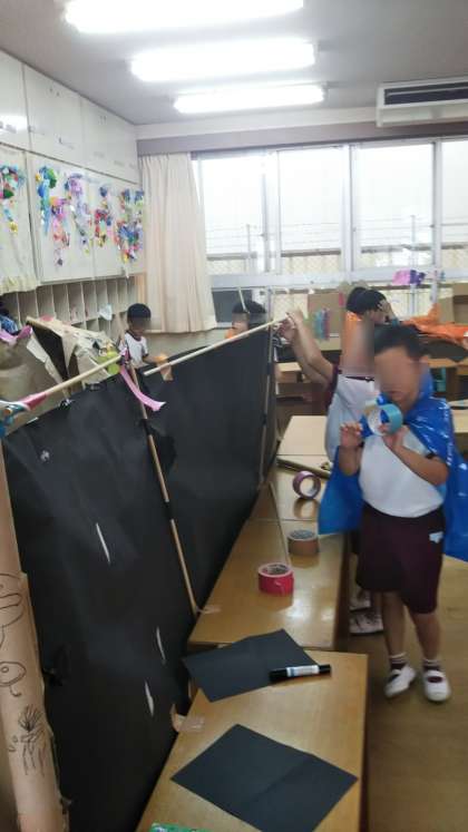 あやめ組のおばけやしきが少しずつ形になってきています。どこにおばけを置こうかな?どんなコースにしようかな?みんなで協力してつくっています。