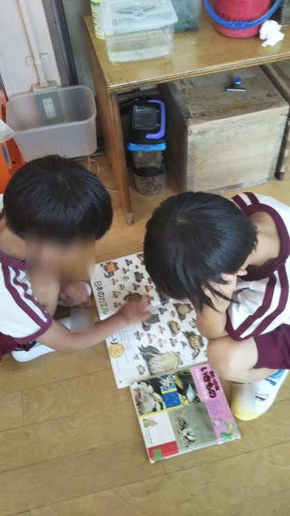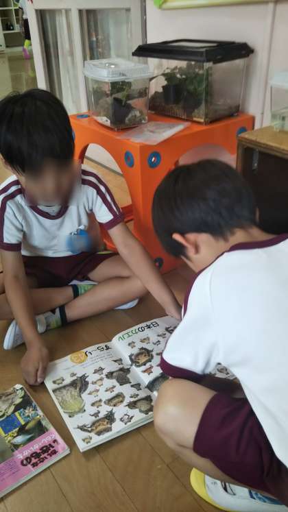 気づいた子どもたちは興味津々!「これ何?メダカ?」「カエルの幼虫(虫と一緒になってる?)やって!」「おたまじゃくし可愛い。何のカエルになる?」「この緑のやつになってほしい」と図鑑をみながら見ていました。元気なカエルになりますように!