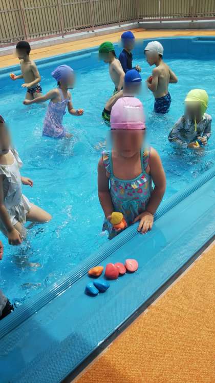 あやめ組は昨日よりも深いプールで遊びました!走って水流をつくったり、貝拾いをしたりして楽しみました。
