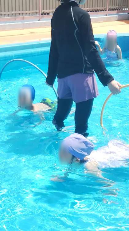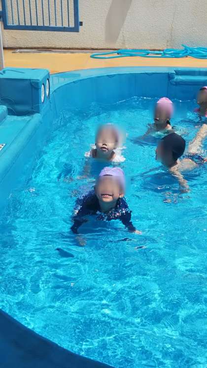 あやめ組もフープをくぐったり、浮き輪やビート板を使って遊びました。全身で水の感触を楽しんでいます♪